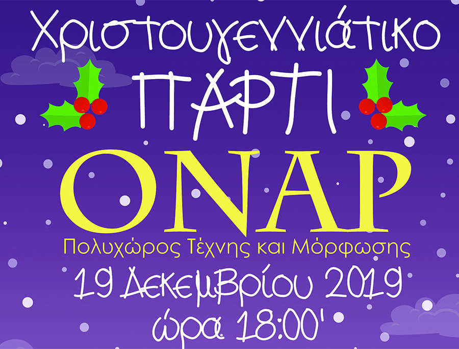 Εν όψει των Χριστουγέννων, σας ανακοινώνουμε με μεγάλη χαρά ότι στις 19 Δεκεμβρίου 2019 και ώρα 18:00 μ.μ. θα πραγματοποιηθεί η Χριστουγεννιάτικη Γιορτή του Πολυχώρου Τέχνης και Μόρφωσης “ΟΝΑΡ”