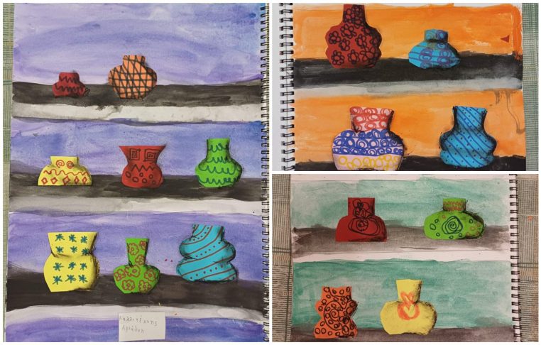Τα παιδιά ολοκλήρωσαν το μουσείο τους με τα αγγεία τους σε δικά τους σχέδια. Δουλέψαμε τα συμμετρικά σχήματα και τον τρόπο που μπορούν να σχεδιαστούν. Αναφερθήκαμε και στα ασύμμετρα για κατανόηση της διαφοράς τους.