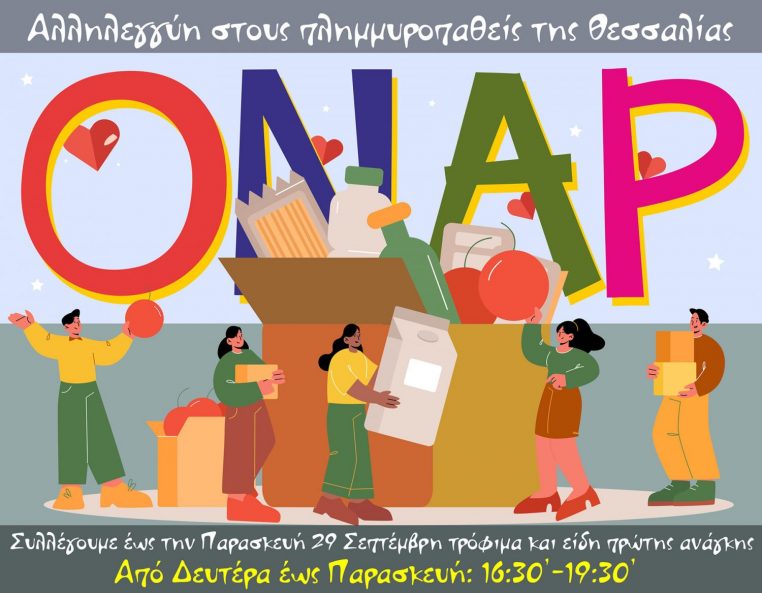 Ο Πολυχώρος Τέχνης και Μόρφωσης «ΟΝΑΡ» εκφράζοντας έμπρακτα την αλληλεγγύη του στους πληγέντες πλημμυροπαθείς της κακοκαιρίας Daniel στη Θεσσαλία, συλλέγει έως την Παρασκευή 29 Σεπτέμβρη τρόφιμα και είδη πρώτης ανάγκης.