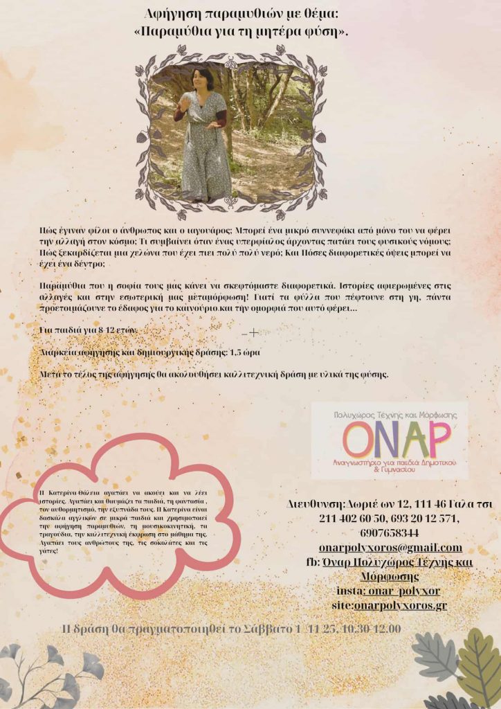 Εργαστήρι θα φιλοξενήσει ο πολυχώρος ΟΝΑΡ το Σάββατο 1η Νοέμβρη διάρκειας 1,5 ώρας, με θέμα «Παραμύθια για τη Μητέρα Φύση και κατασκευές με υλικά της».