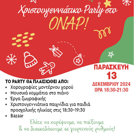 🎄 Υποδεχόμαστε την περίοδο των γιορτών και σας καλούμε, φίλοι και φίλες , στο χριστουγεννιάτικο πάρτι του Πολυχώρου Όναρ, την Παρασκευή 13 Δεκεμβρίου 2024.