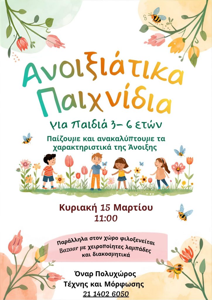 Ο Πολυχώρος Τέχνης και Μόρφωσης “Όναρ” διοργανώνει την Κυριακή 15 Μαρτίου, στις 11:00, μια ολοήμερη ανοιξιάτικη εκδήλωση για παιδιά και οικογένειες.